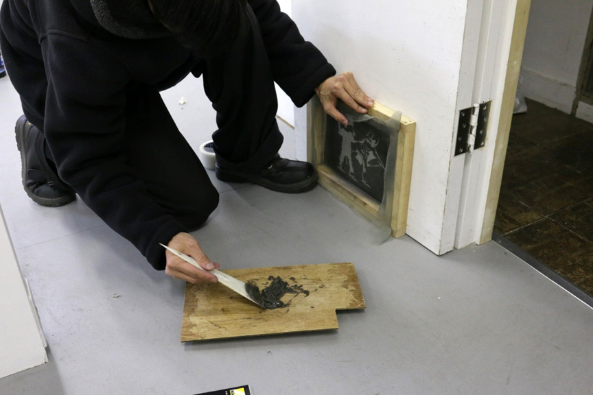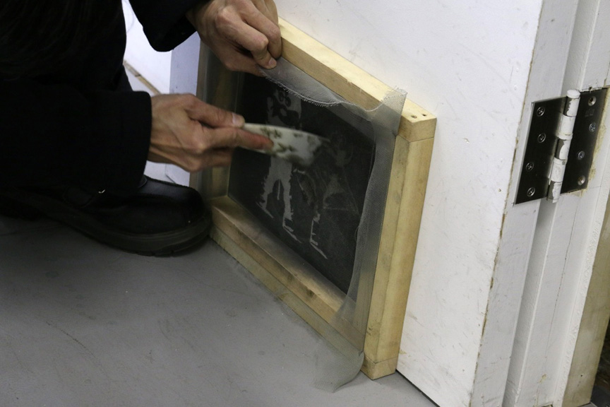 VSP friend Stefan Hoffmann recently spent time in Japan working on another excellent project (see it here). While there he met an artist, Taku, that does vertical screen printing. Here’s what Stefan had to say: “I met a vertical screen printer with a really nice technique when I was in Tokyo. No ink, just dirt he found on the street, added some wheat paste, and pushed his mixture through a very coarse mesh. I was amazed about the amount of detail and the thickness of the ‘ink layer’.” See documentation of Taku’s technique below. Photos by Stefan Hoffmann